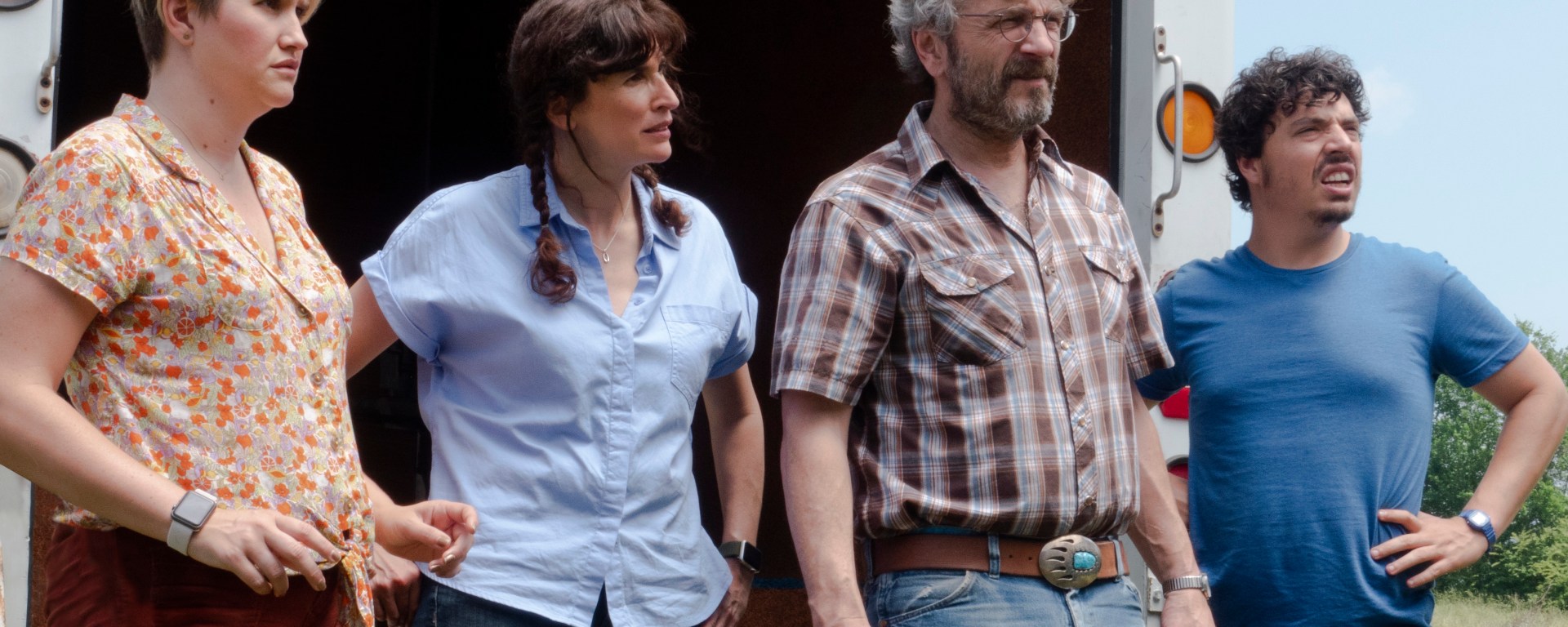 Jillian Bell as “Cynthia”, Michaela Watkins as “Mary”, Marc Maron as “Mel” and Jon Bass as “Nathaniel” in Lynn Shelton’s SWORD OF TRUST. Courtesy of IFC Films. An IFC Films release.