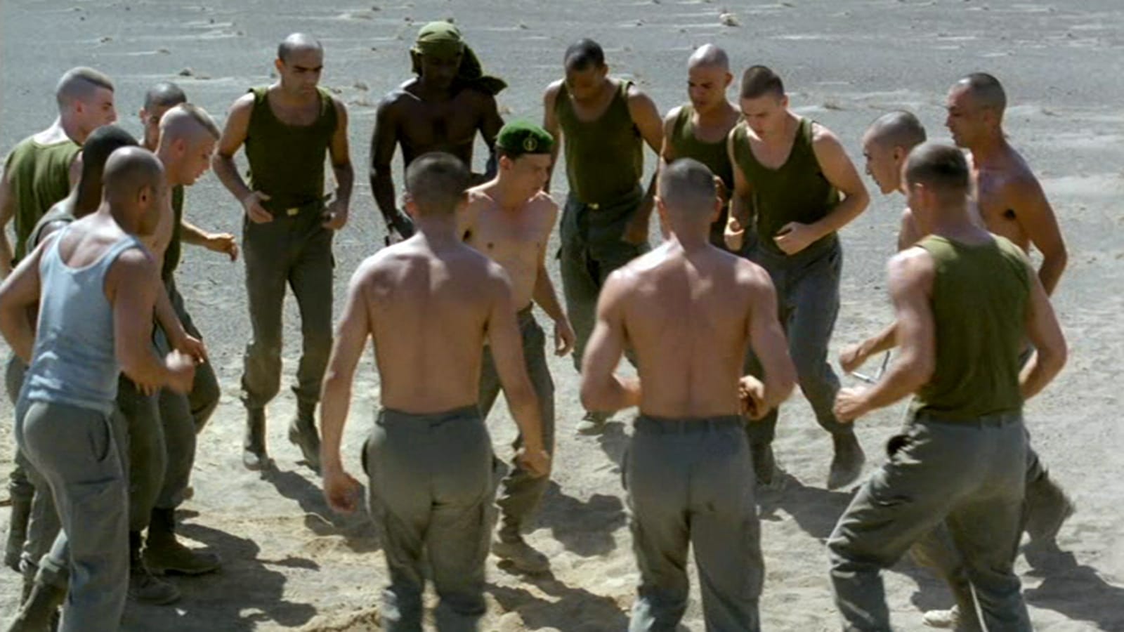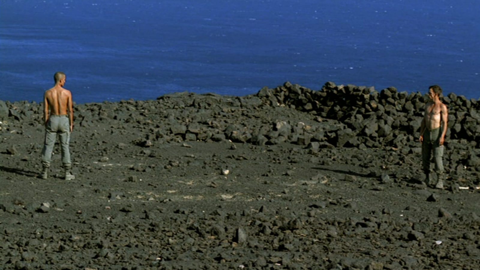 Galoup and Sentain bicker and fight, and Denis and cinematographer Agnès Godard eschew their masculine bravado by stripping it of violence and choreographing their movements. When one strikes the other, the punch is slowed to the point of softness. When they perform calisthenics with the rest of the legionnaires, the motions look like ritualized worship. It gives the men a spiritual quality, but it also gives them sensuality.