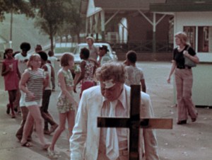Other indignities befall the elderly of the park, but our man in the all-white suit bears the brunt until indignities give way to aggression. A biker gang attacks the man in the all-white suit, but not in a conventional manner—ditto for the priests who wander the park carrying an oversized Bible like it’s a heavy table. Then there’s the woman sitting on a coffin outside one of the rides and the Grim Reaper wandering unseen between guests.