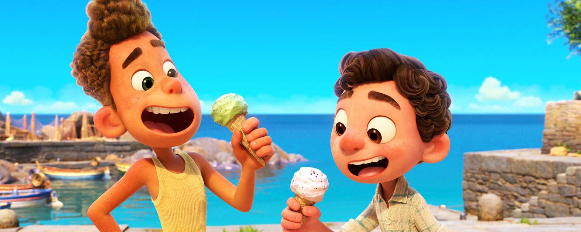 Luca, the latest feature from Disney/Pixar, is an airy story of summer friendship on the Italian Rivera. Jacob Tremblay voices the titular character, an amphibious creature that looks and acts like a real boy on dry land, but when touched by water, his skin turns to bioluminescent scales, his feet to flippers, his hair to fins. It’s his natural state, but he moves between the two worlds with ease. As does Alberto (Jack Dylan Grazer), another sea monster who also prefers land over ocean. He’s a little bit older than Luca, a little bit more knowledgeable—or thinks he is—and a little bit more vulnerable. Luca left a good family back at the cove; Alberto was the one left behind.