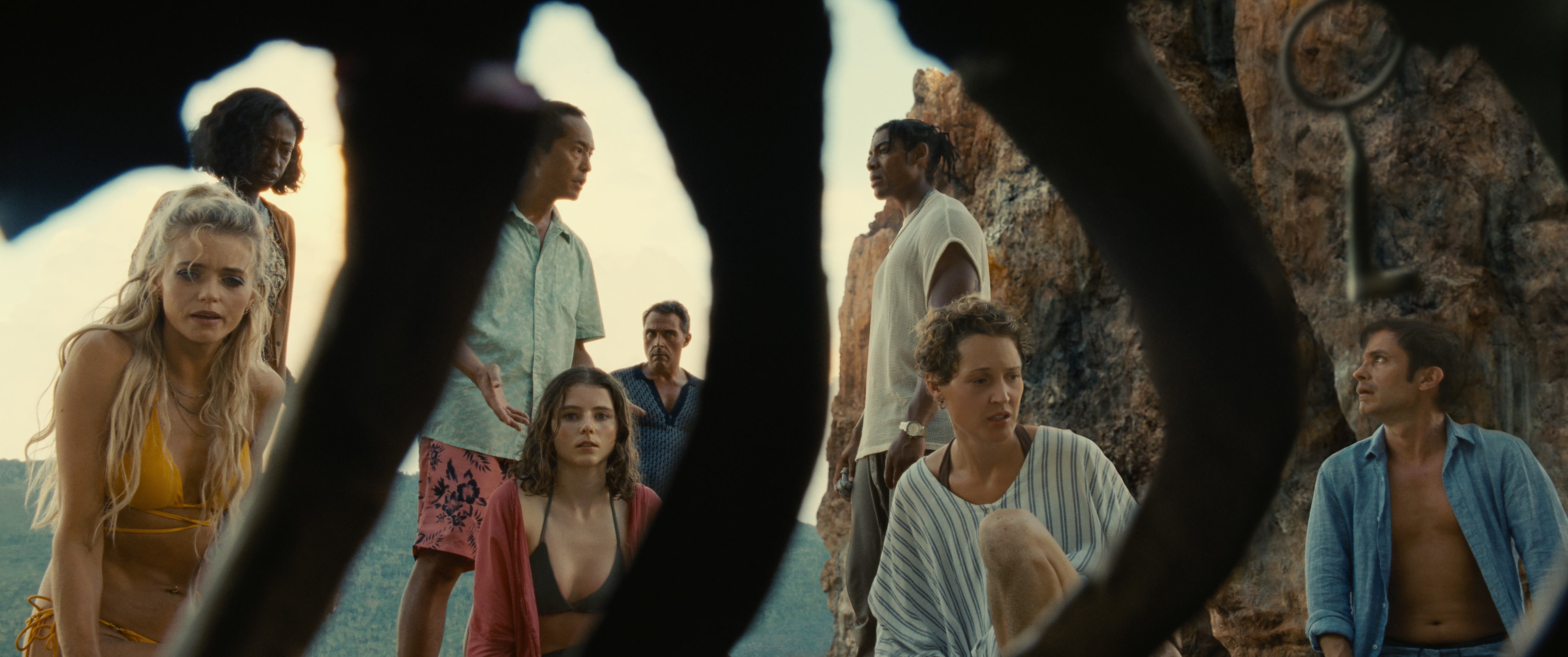 That second kid, he’s Trent (Nolan River), and he’s here on vacation with his 11-year-old sister, Maddox (Alexa Swinton), and parents, Prisca (Vicky Krieps) and Guy (Gael García Bernal). Here is an all-inclusive beach resort on a remote island somewhere far away from the real world, the kind of place where the staff hands you a specialty-made cocktail when you arrive and have activities planned for every waking minute. Trent and Maddox don’t know it yet, but this is their last hurrah as a family. You see, Prisca is a museum curator, and she’s stuck in the past. Guy is an actuary, and he can’t stop thinking about the future. Their marriage is failing because neither is in the present. Get it? Prisca also has a medical ailment, but I’ll leave that to the movie. Now it’s time to talk about the beach: It’s a private beach you can only visit if the resort manager (Gustaf Hammarsten) likes you and arranges for you to see it. Lucky for our foursome, he likes them and arranges a day on the beach.