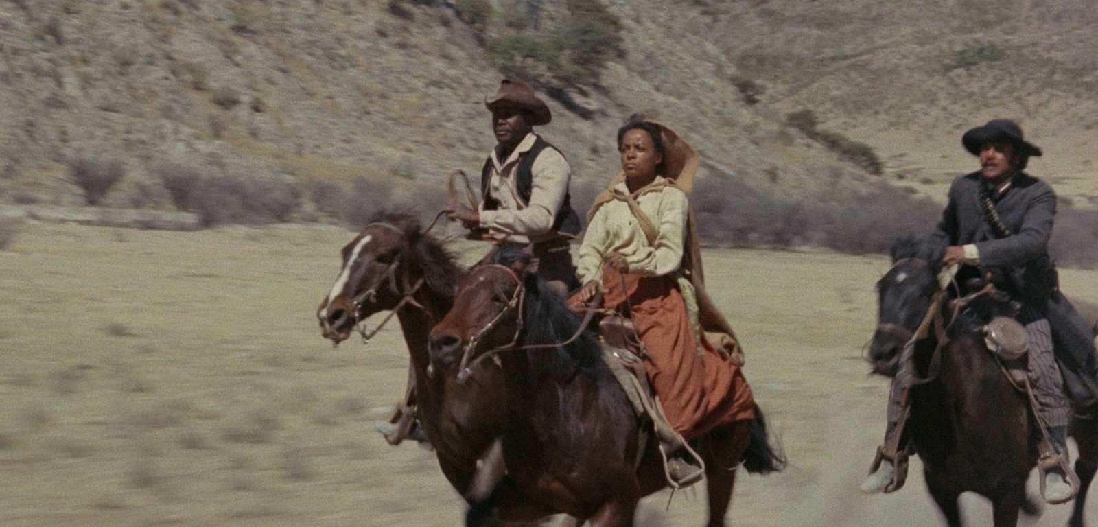 It opens like any other western: Sepia soaked still photographs of settlers in wagons traversing a wild frontier while title cards credit the actors, the filmmakers, and the dedication. Then the pictures begin to move. In the background, a lone rider on a horse. There’s always a lone rider on a horse, usually a heroic silent type. But as those dusty sepia images turn to color, the camera moves in closer, a Jew’s harp twanging and a harmonica wailing on the soundtrack. The lone rider is Sidney Poitier, looking about as regal as one can in plaid pants and a pink western shirt.