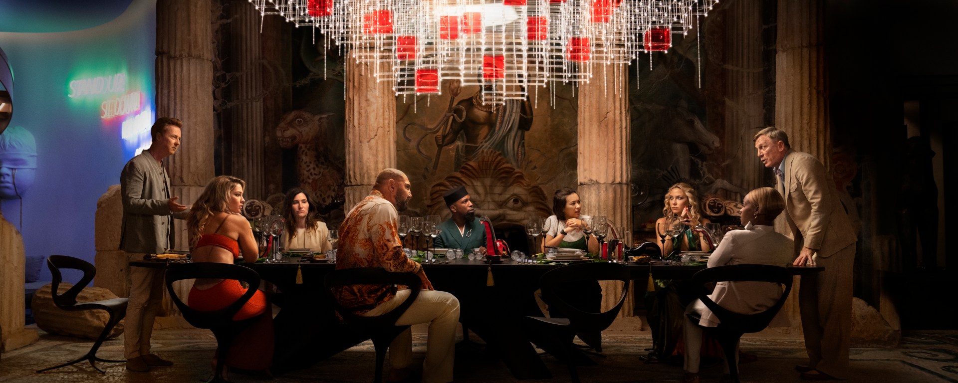 The story unfolds as such: It’s May 2020, and COVID-19 is more of a nuisance than a threat. A mysterious puzzle box appears at the front door of four friends: Rocket scientist Lionel Toussaint (Leslie Odom Jr.), Connecticut governor Claire Debella (Kathryn Hahn), socialite and model Birdy Jay (Kate Hudson), and men’s rights influencer Duke Cody (Dave Bautista). The box is an invitation from Miles Bron (Edward Norton), a fabulously wealthy billionaire cut from the same cloth they make Steve Jobs effigies. Miles is a disrupting visionary who says crap like he wants to be remembered in the same breath as the Mona Lisa, but I guess he made his fortune by turning children into NFTs—the source of his empire is in dispute and largely dismissed in a series of murky jokes.